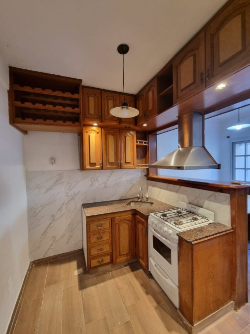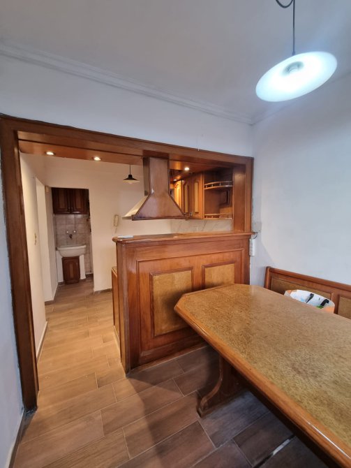 Cocina con muebles bajo y sobre mesada, artefacto de cocina y extractor. Juego de comedor.