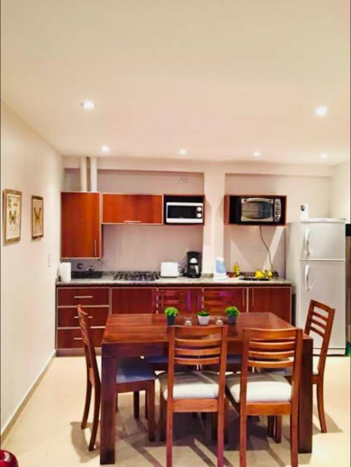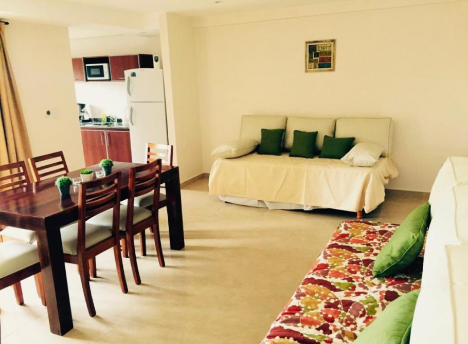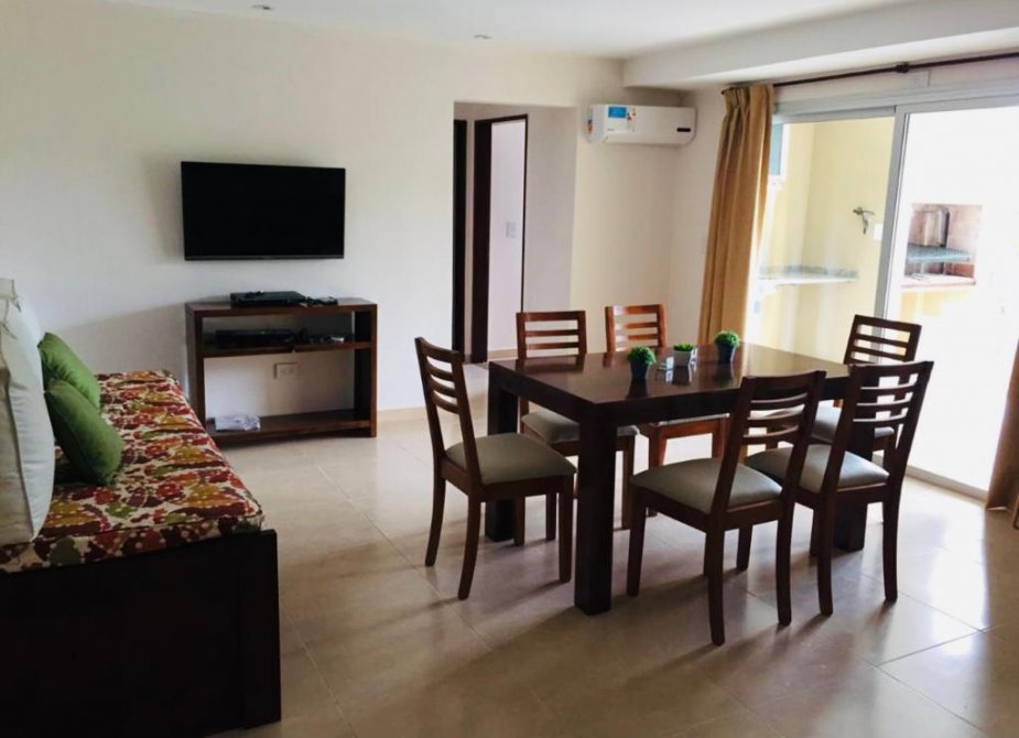 1 departamento para 3 personas de 30 m2 con habitación con cama matrimonial con placard Living comedor con soca cama Cocina Baño con ducha Balcon con parrilla.